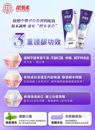 北京同仁堂首次推出專為護齦而設的 “齦養素”中藥草本牙膏系列,讓修護牙齦概念重新定位,彙集中國古代的養牙智慧及現代科研之成果, 按照中藥君臣佐使的配伍,根本調理達至 “標本兼治”,全面維護口腔微環境平衡。集“緩解 + 滲透 + 修復”於一身的“齦養素 – 多效護理牙膏”提供3重護齦功效,針對牙齦紅腫、疼痛、刷牙時出血等問題。成分天然,主要成分赤靈芝提取物通過全球良好農業規範(GACP)認證,並配有天然冰片、牡丹皮、救必應、甘草、歐洲母菊等,鞏固牙齦,口氣清新,好牙就要速養齦。